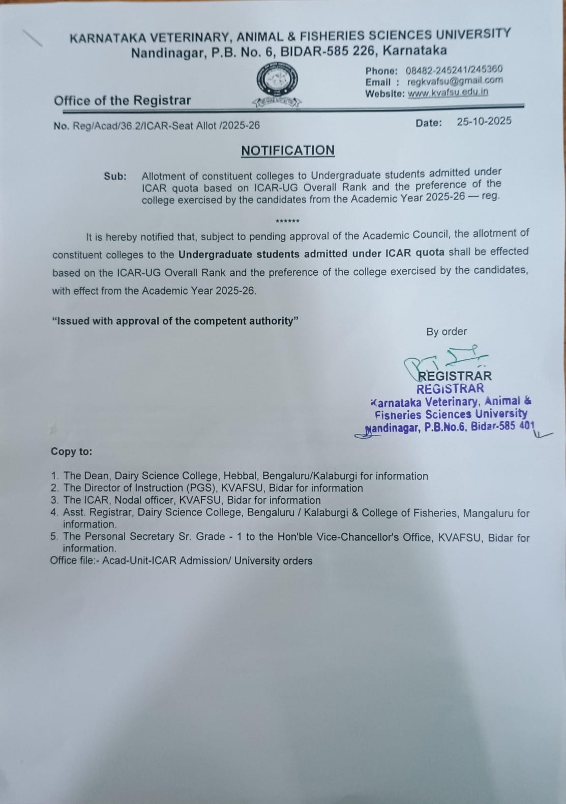 Notification of Provisional UG Admission Under ICAR Quota For The A.Y: 2024-25